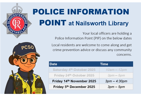 Friday 14th November 2025 PCSO Francis will be at Nailsworth Library between 3pm-4:30pm |